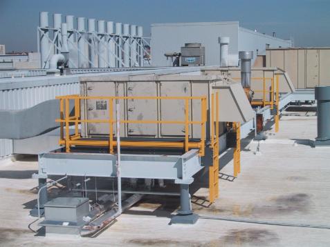 Sidemount handrail with step through ladder to access roof top air conditioners.